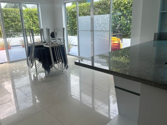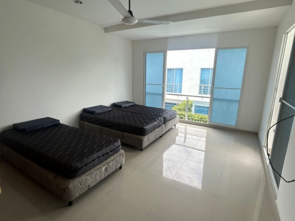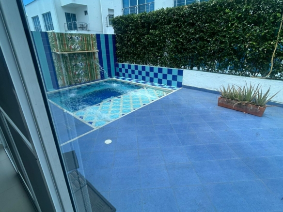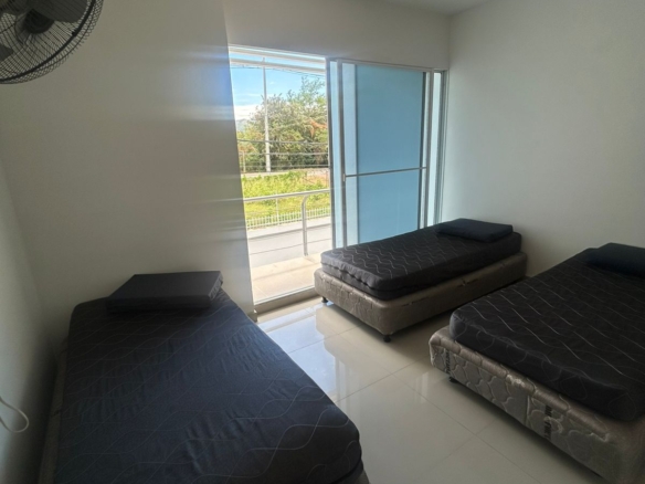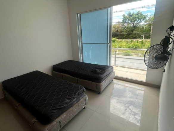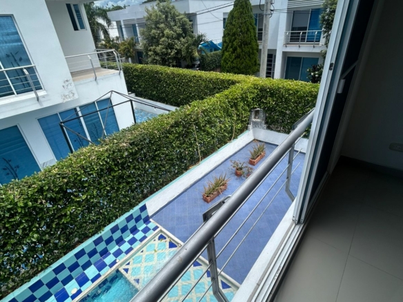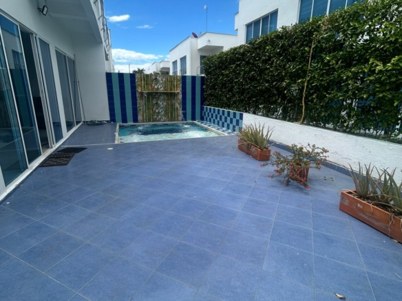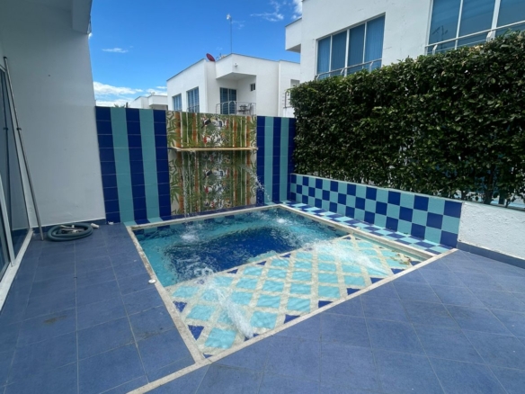 cuenta con 4 habitaciones grandes con balcones amplios, escalera con espejo de agua, 4 baños, sala y comedor amplio, cocina integral abierta, cuarto de lacena y de ropas, zona BBQ, parqueadero, Jacuzzi privado, también hay acceso a las zonas comunes del condominio como (piscina, cancha de tennis y múltiple, spa, sauna y turco, parque infantil, gimnasio).